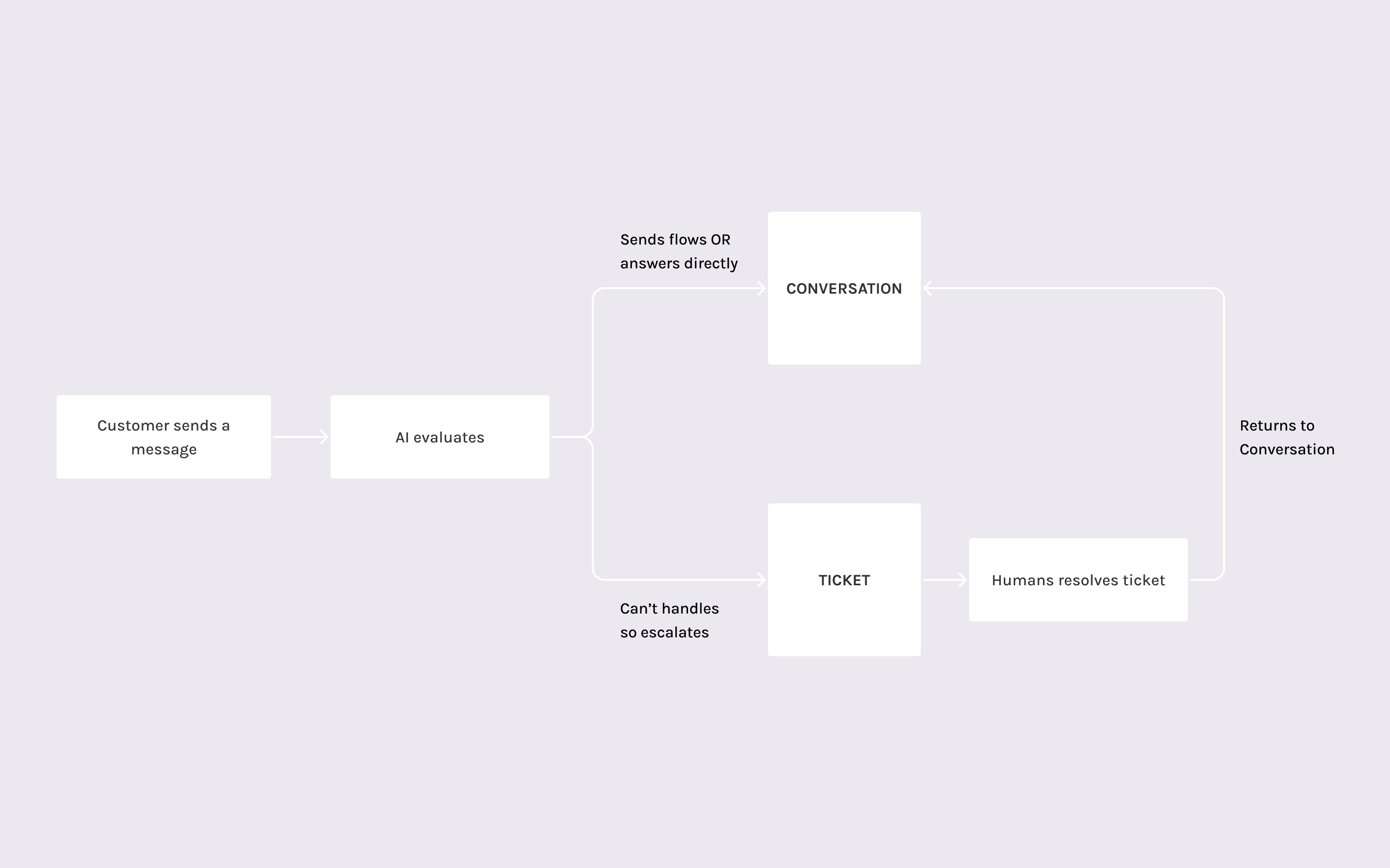 I redesigned the conversation experience into an inbox that gives tickets prominence while keeping automated conversations accessible. The new structure splits what was previously "Conversations" into two views: