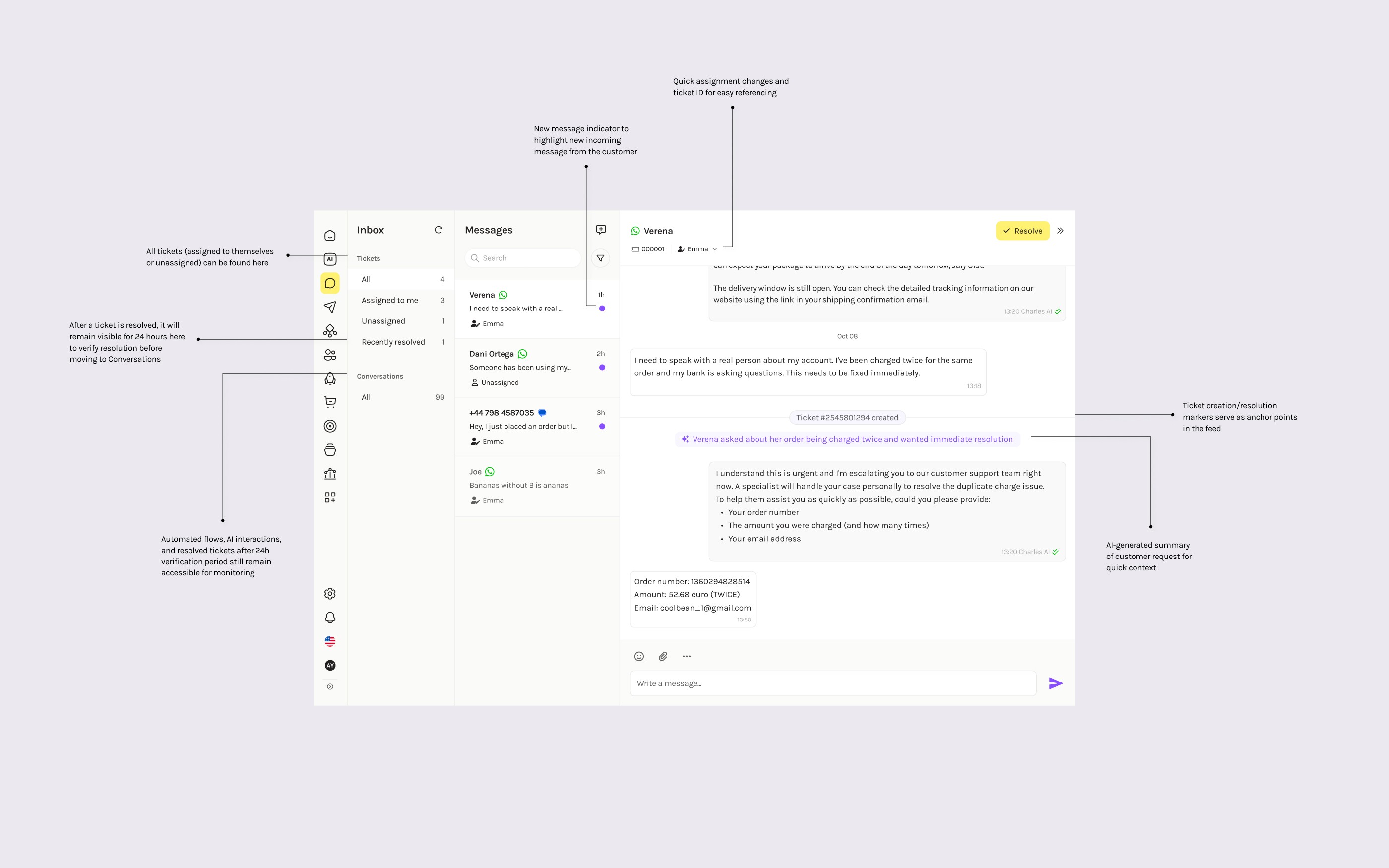 The new inbox structure turns hundreds of mixed conversations into a manageable queue. Agents can now quickly identify escalations, understand context through AI summaries, and take action without digging through automated flows. The ticket system finally matches how agents actually work.