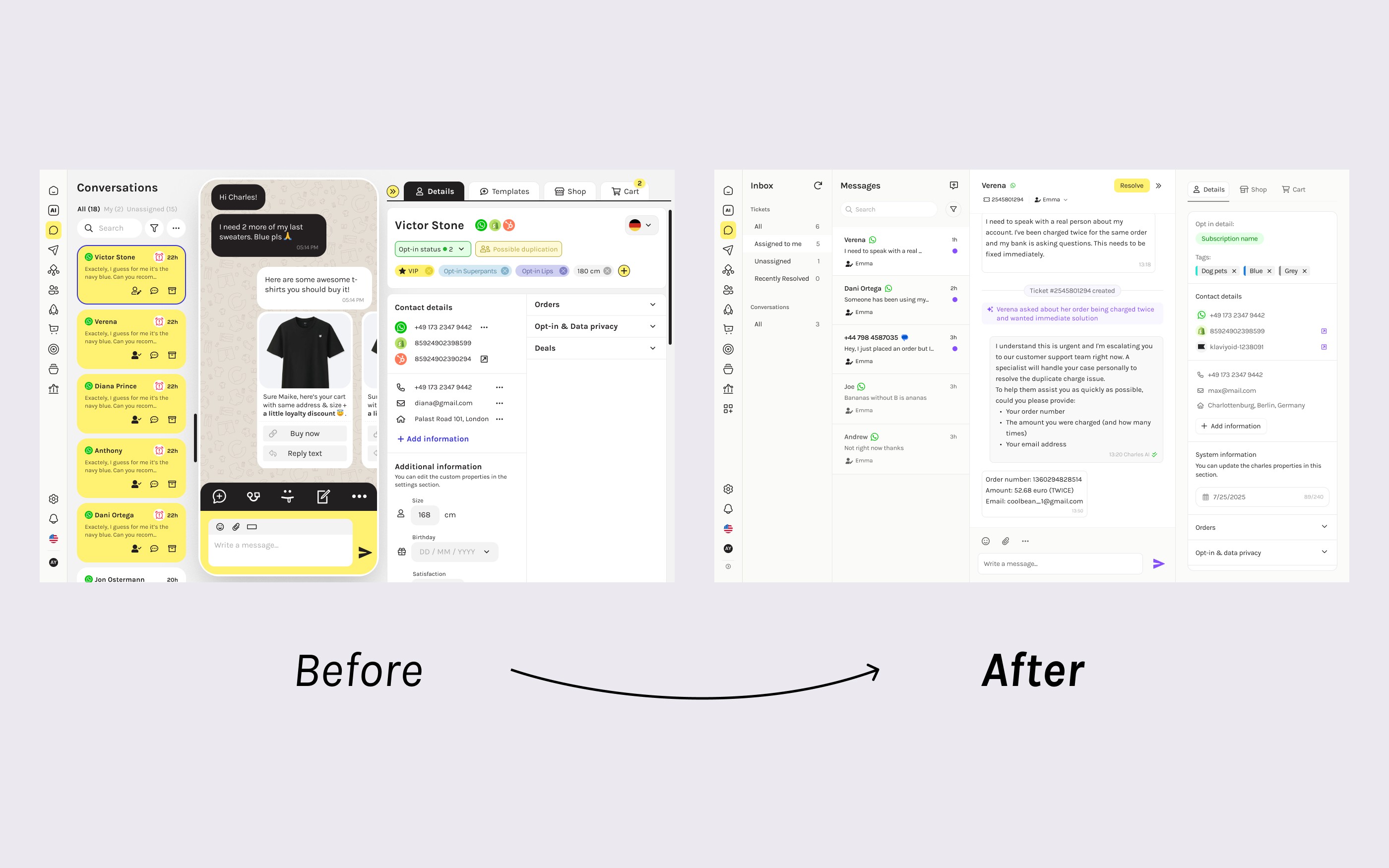 The design went through multiple iterations based on feedback from the customer support team and technical constraints around development capacity. Some features had to be delayed or adjusted to work for both AI-enabled and non-AI customers using the same interface.