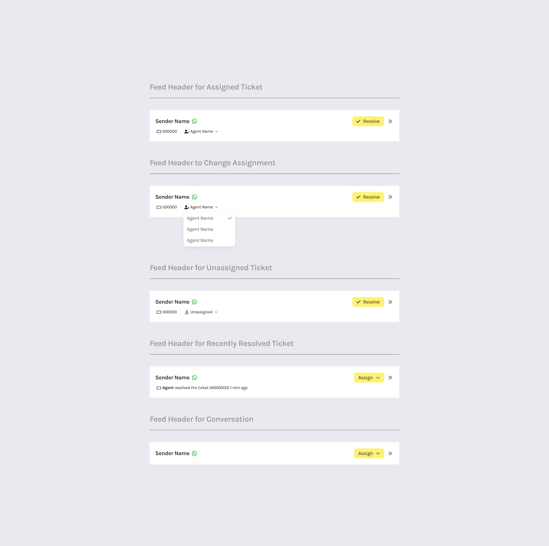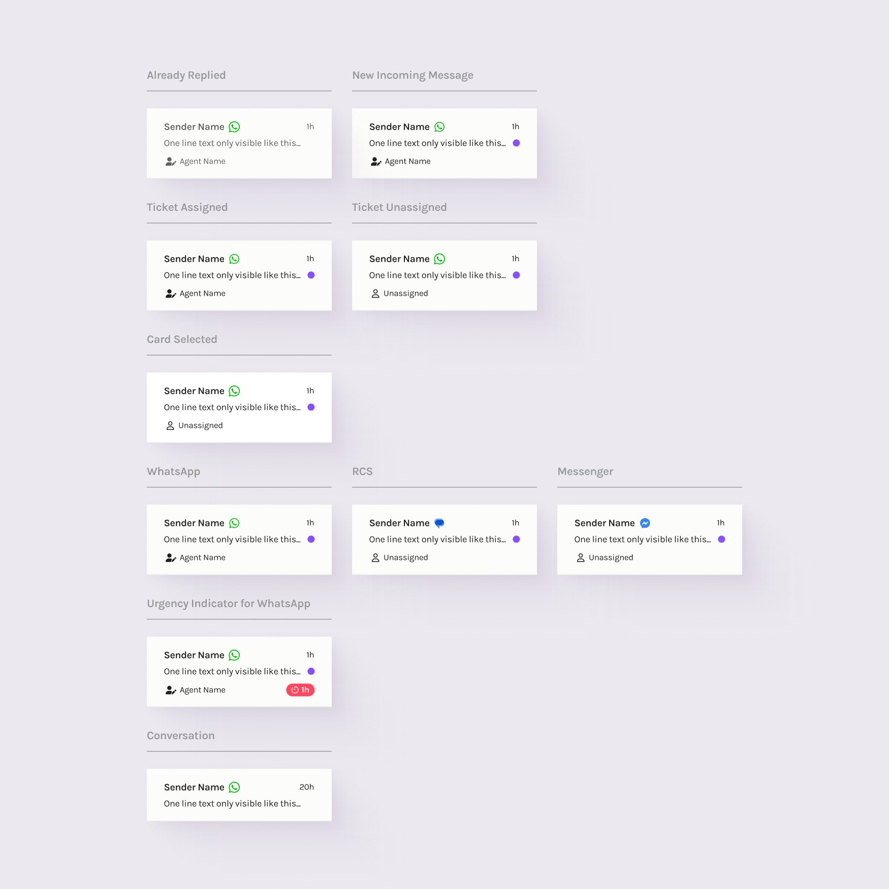 The components would adapt based on context, showing different information depending on assignment status, channel type, urgency level, and ticket state.