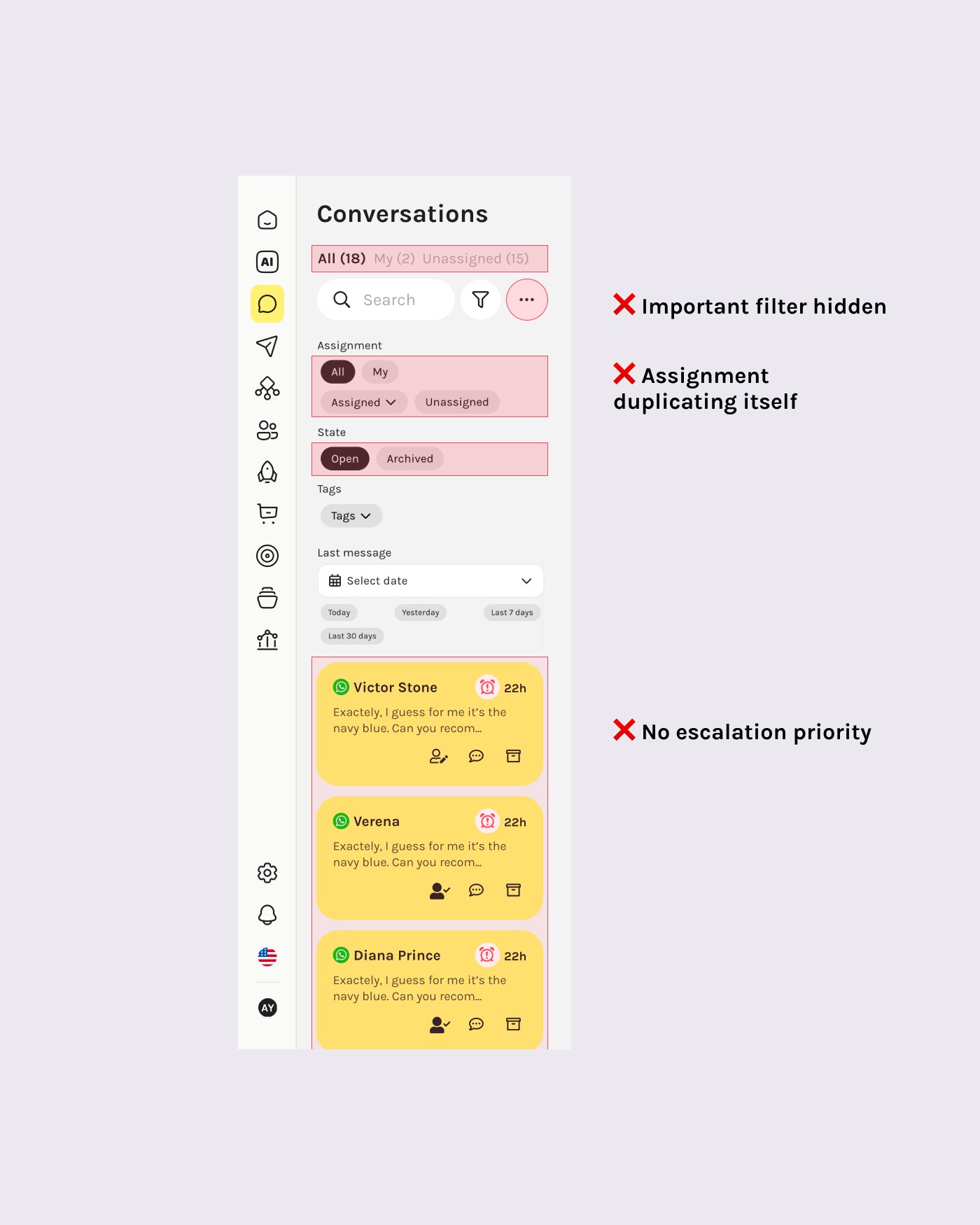 With AI handling most conversations and escalating edge cases, this model broke down. Agents needed to distinguish between escalations requiring urgent attention and automated conversations running in the background, but the interface can only differentiate response status.